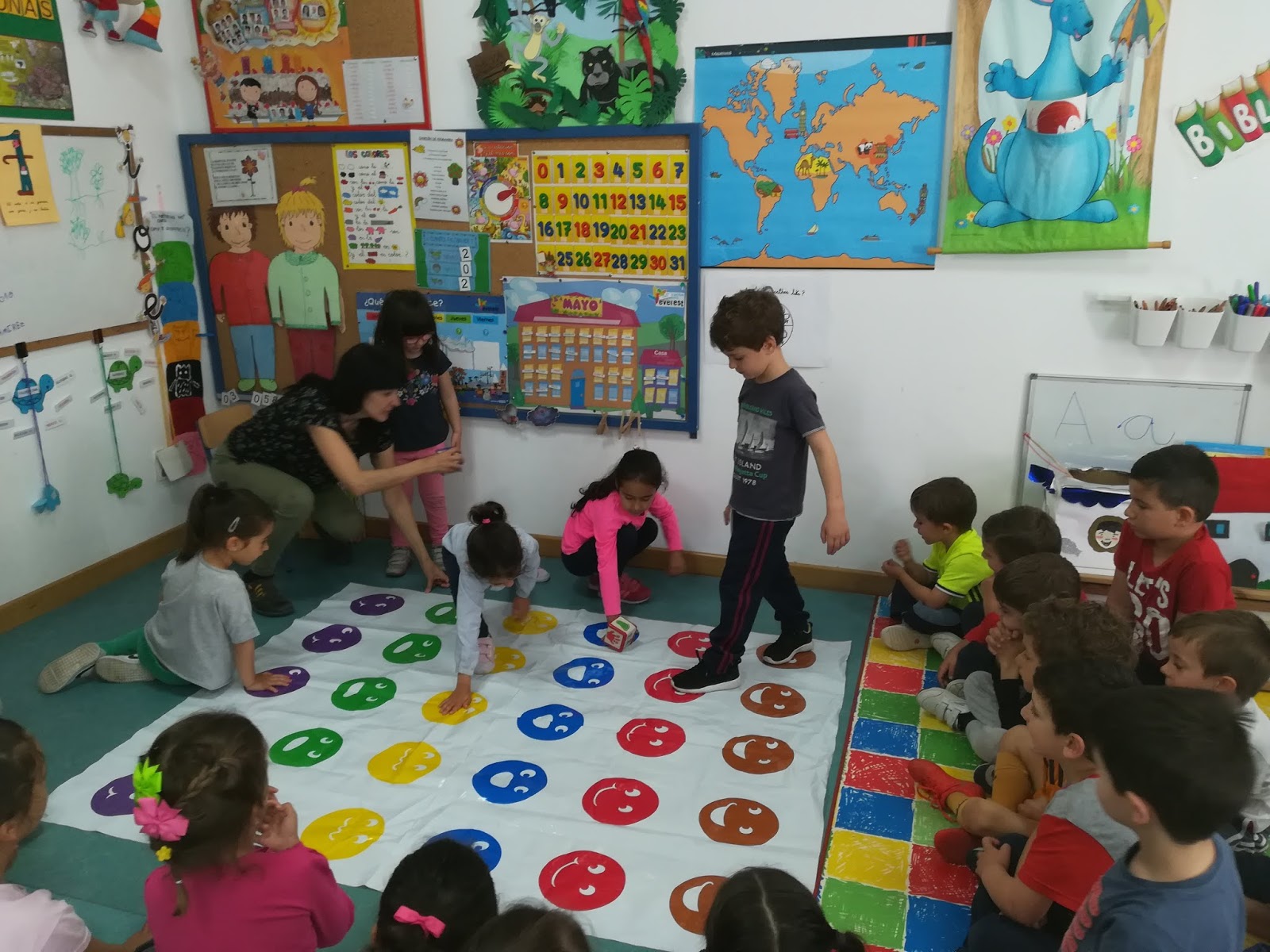 A continuación, nos lo pasamos genial jugando al twister, donde acabamos enredando nuestros pies y manos.